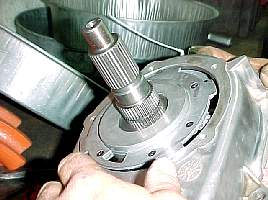 Time to Remove the output shaft. To do this, you need to pull the front output shaft straight out. When there is enough slack in the chain, it will come right off the rear output shaft. While you are this far into the transfer case, it is a good idea to inspect for any damage and repair it if there is any. |
