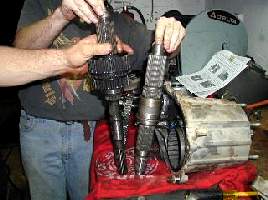 After the chain is removed and out of the way it is time to remove the rear output shaft do this by pulling it straight out, it should come out with no problems. Notice the difference in size between the stock output shaft and the new Advance Adapters shaft. This is one of the main reasons I chose this kit. It may be a little more expensive but unlike other kits that you cut and drill the tail housing, this one replaces the output shaft, which is one of the weak links in the drive line. |
